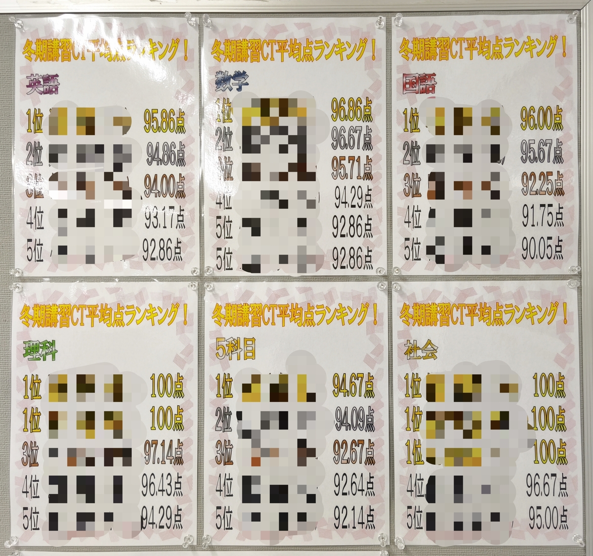 吉川美南校では計7回あった復習テストの平均点のランキングを作成しています。