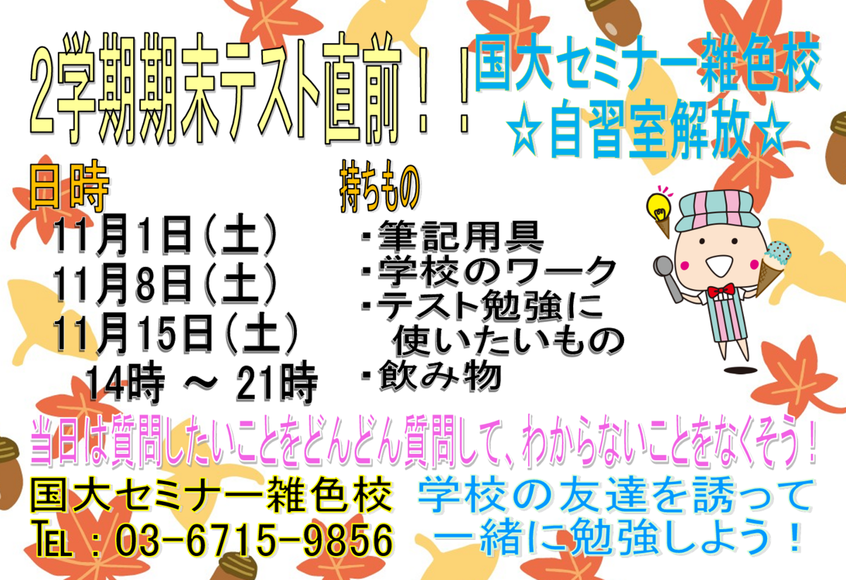 もしも、結果が振るわなかったとお考えの方がいらっしゃいましたら、ぜひ国大セミナーの夏期講習会で一緒に1学期までの総復習をしませんか?国大の講習会はすべて復習になります。2学期以降の勉強をするにあたって1学期までの範囲が定着していないなんてことがあっては大変ですからね…