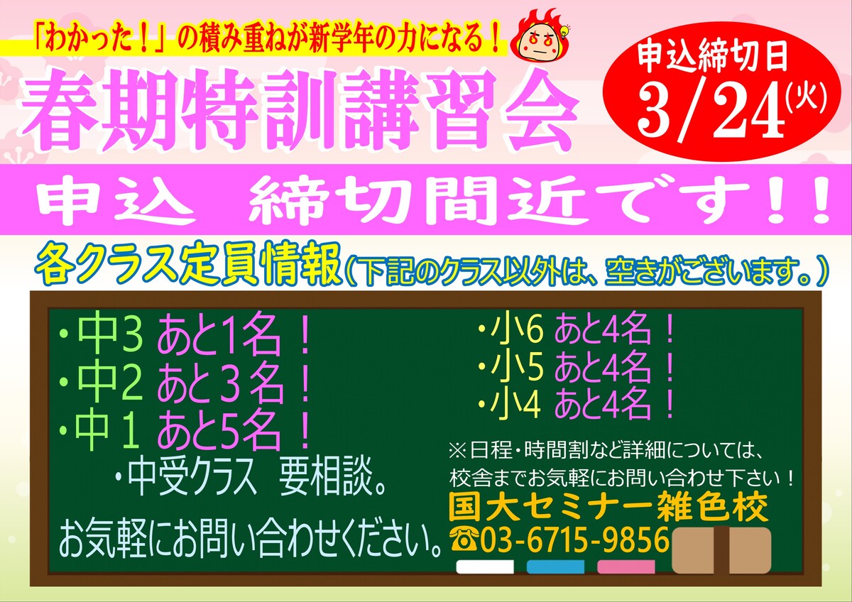 【国大セミナー雑色校】春期講習会 申込締切間近!!